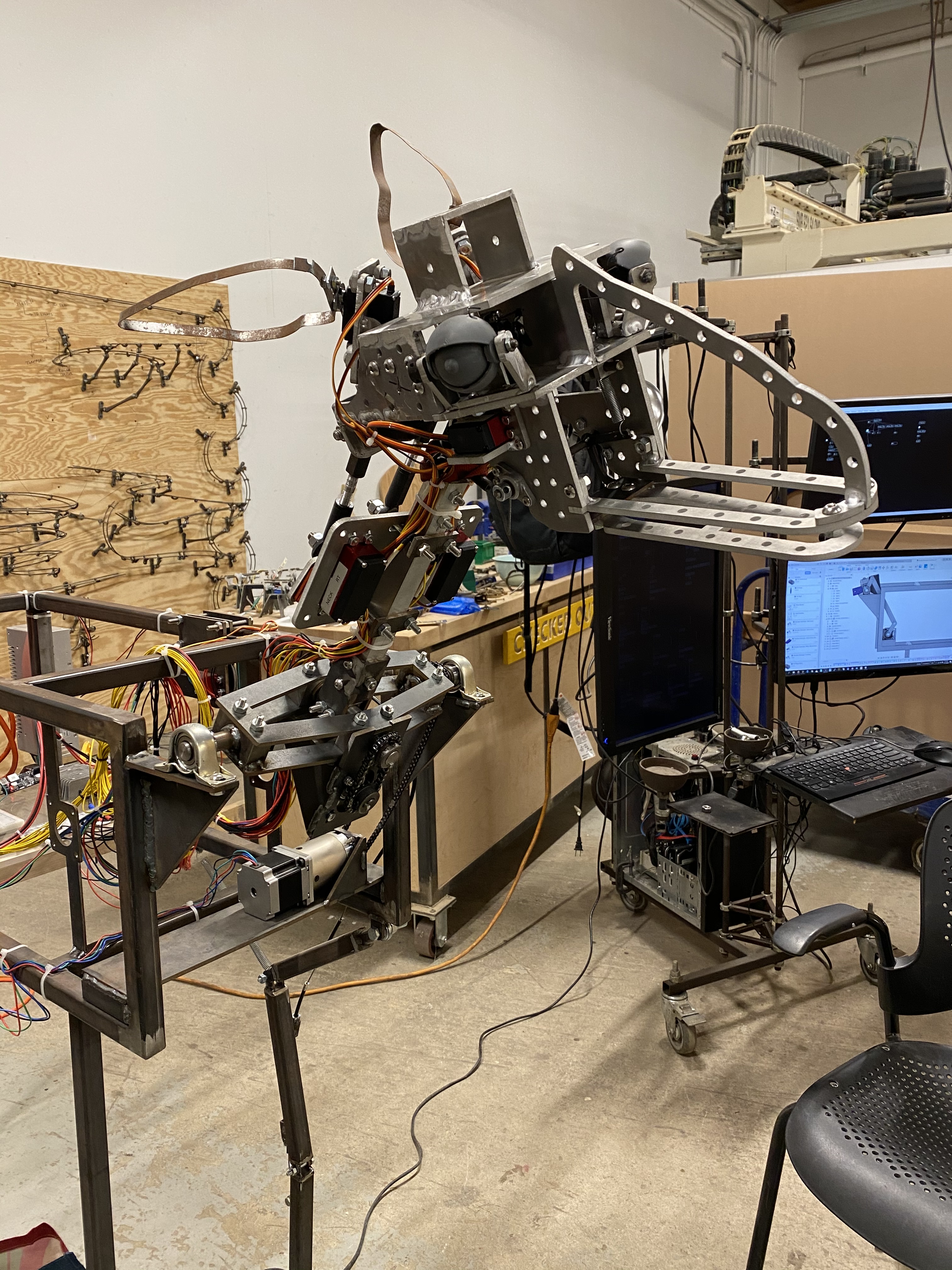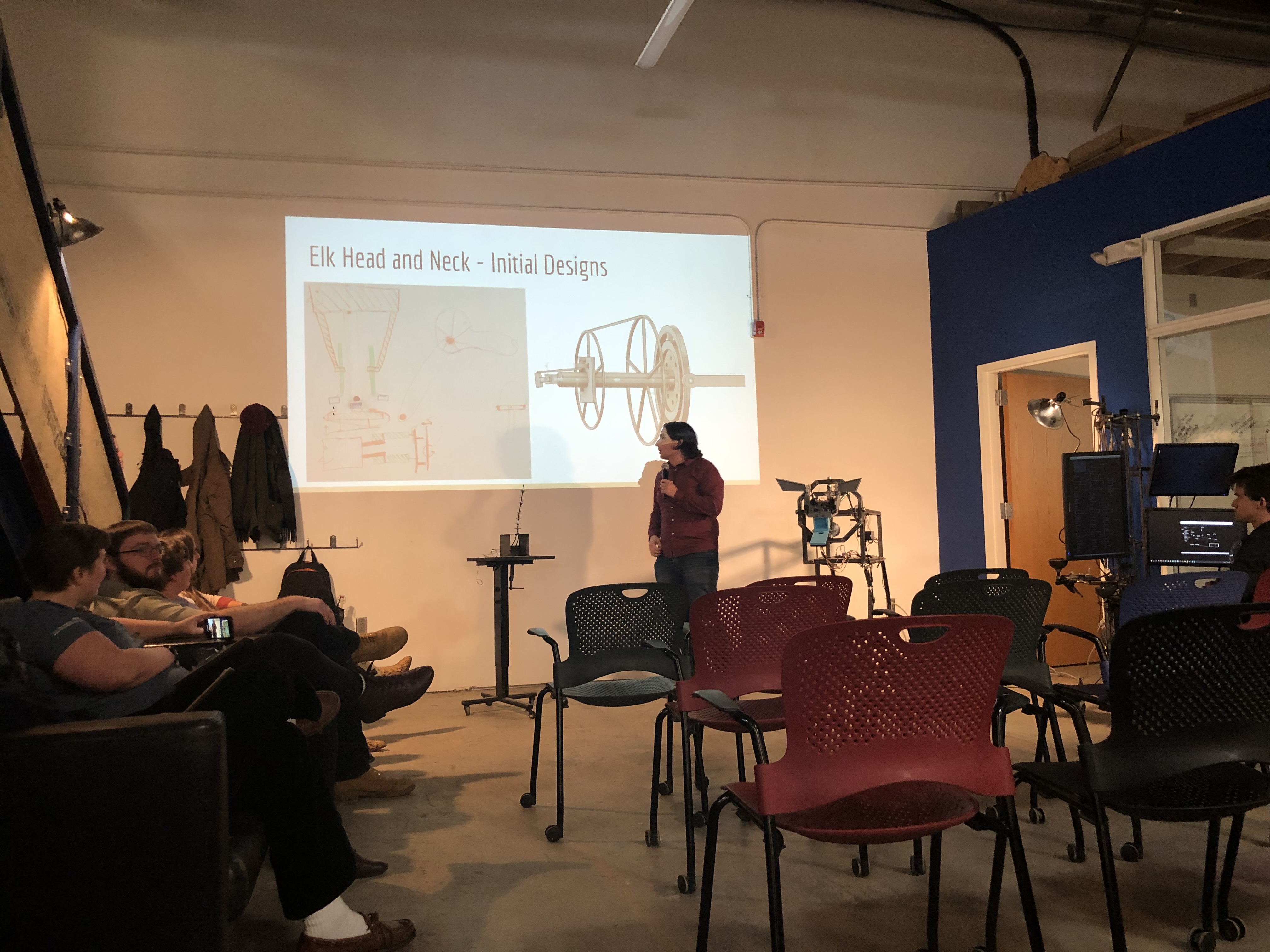 The engineering senior design class was moved online in March of 2020 and stopped their ability to fabricate the animals. It also meant the collaboration with New media students was not able to happen. The production has been delayed until November 2022. This creates opportunities for us to create more cross disciplinary coursework between engineering, drama (costume design), and New Media. The animals continue to be fabricated by engineering student workers and STEAM studio’s design specialist, Chas LLewellyn.