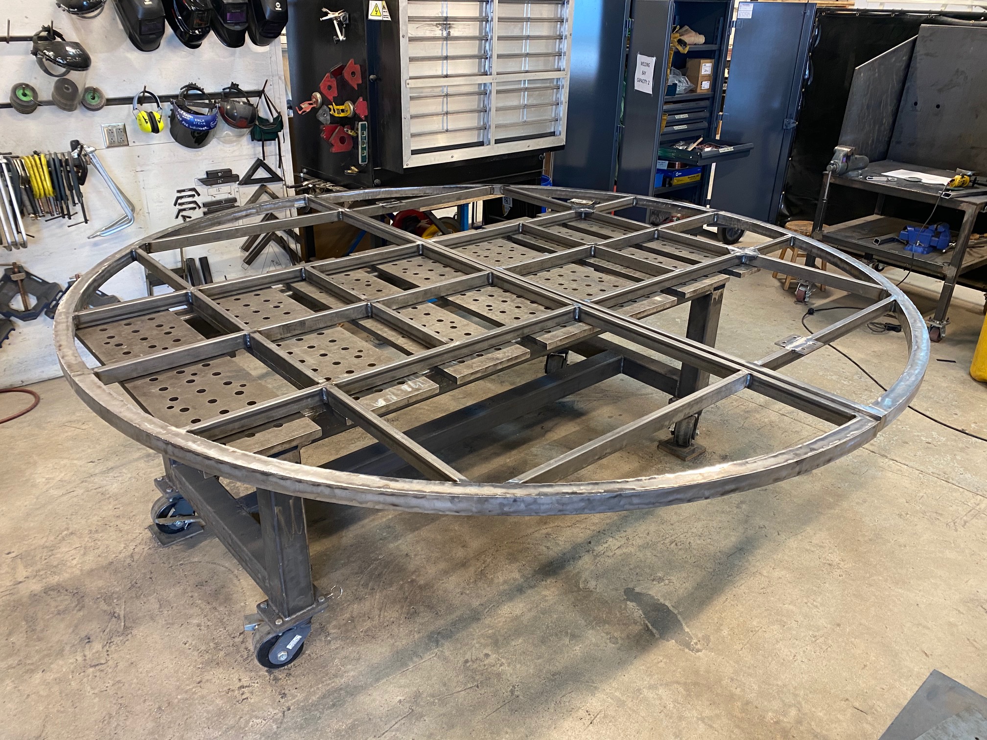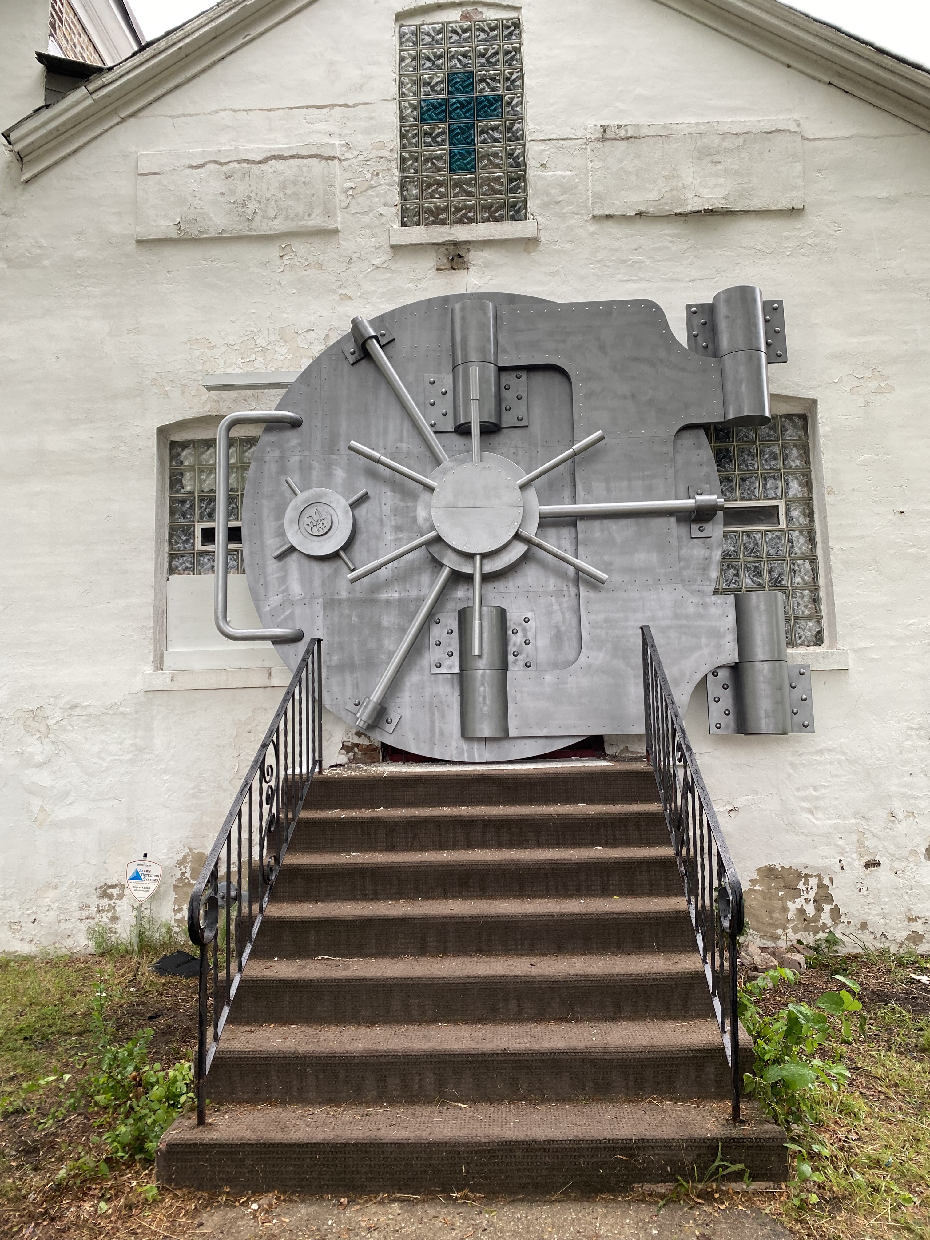 The door is a functioning vault door 10ft in diameter and weighing nearly 1500 lbs. It has a barn door functionality rolling on ½” steel track. It has a kinetic locking mechanism that was designed by students in the Maymester iteration of the Creative Fabrication class that I co-taught with my mentor, Susan Rieser. It was fabricated primarily from 16ga sheet steel and rectangular tubing.