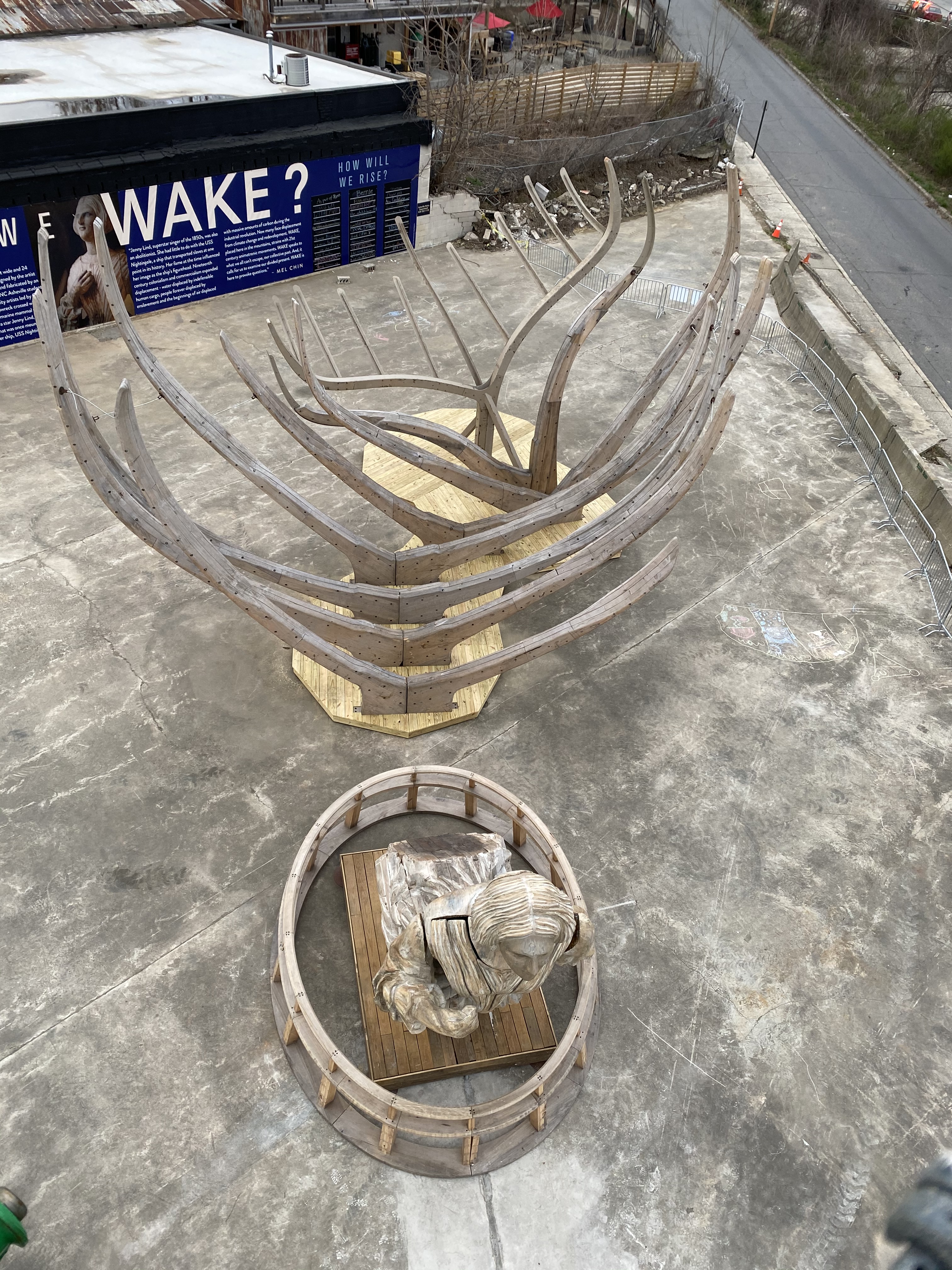 Wake is Mel Chin’s 24 foot tall, 34 foot wide, 54 foot long sculpture composed of an animatronic ship’s figurehead and the skeletal remains of the 1850’s clipper ship to which she was once affixed. The figurehead is that of Swedish Opera star Jenny Lind. Brought to the United States for a first of it’s kind musical tour, she became an icon. A ship builder in New England fell in love with her likeness and had it carved into the figurehead for the fastest clippership of it’s time, the USS Nightingale. Lind, an abolitionist, had no say in this. The ship was ultimately used to carry enslaved peoples and was captured by the Union army in the civil war.