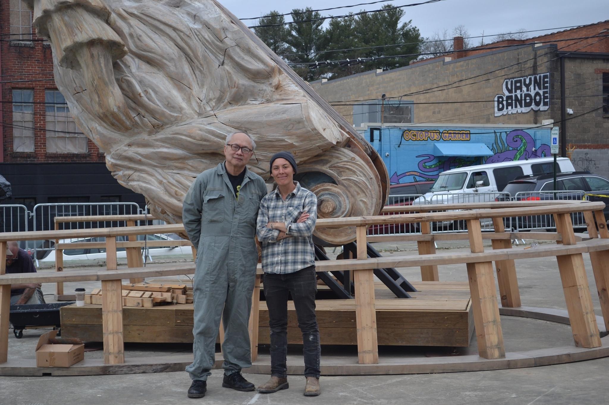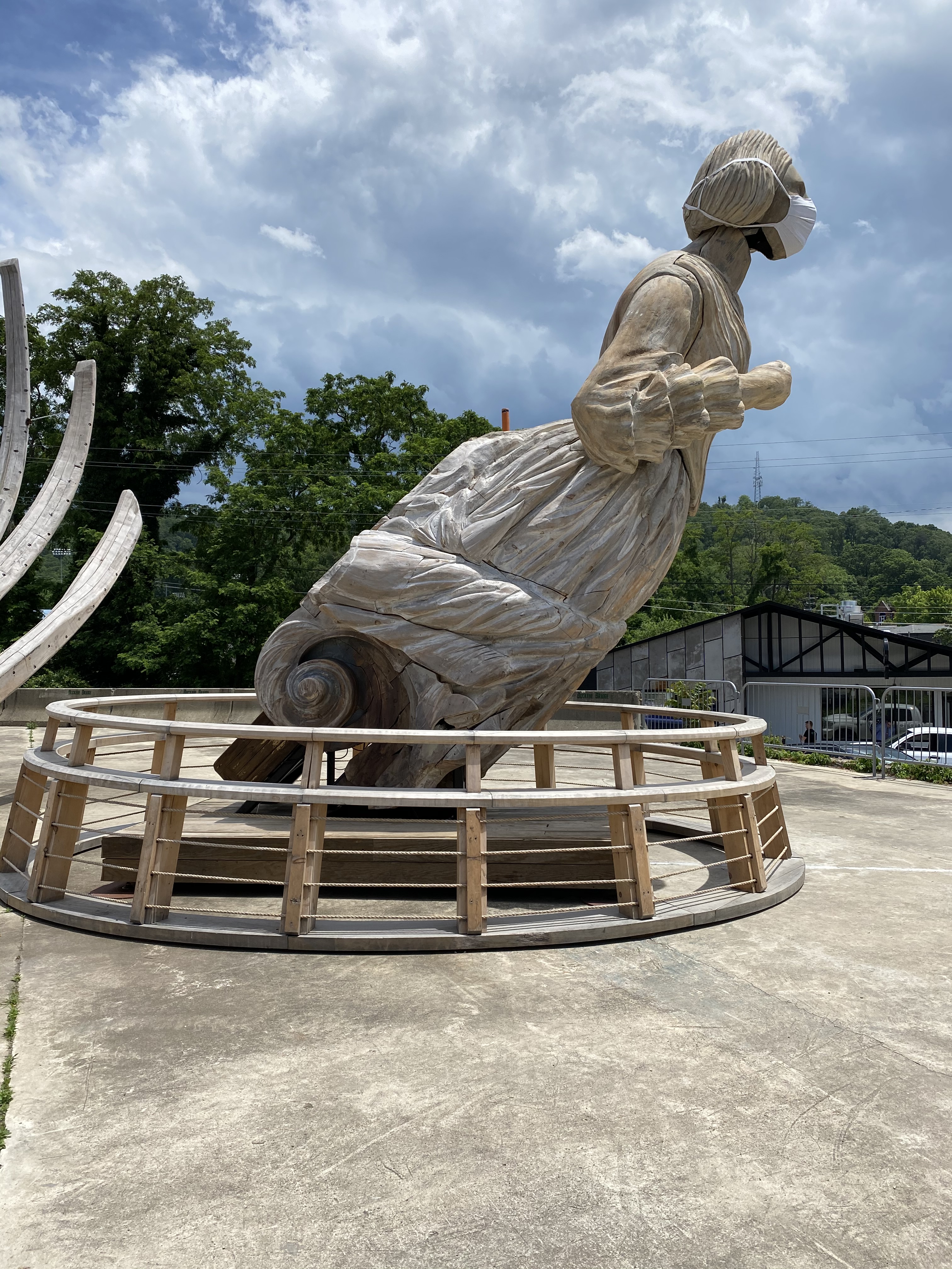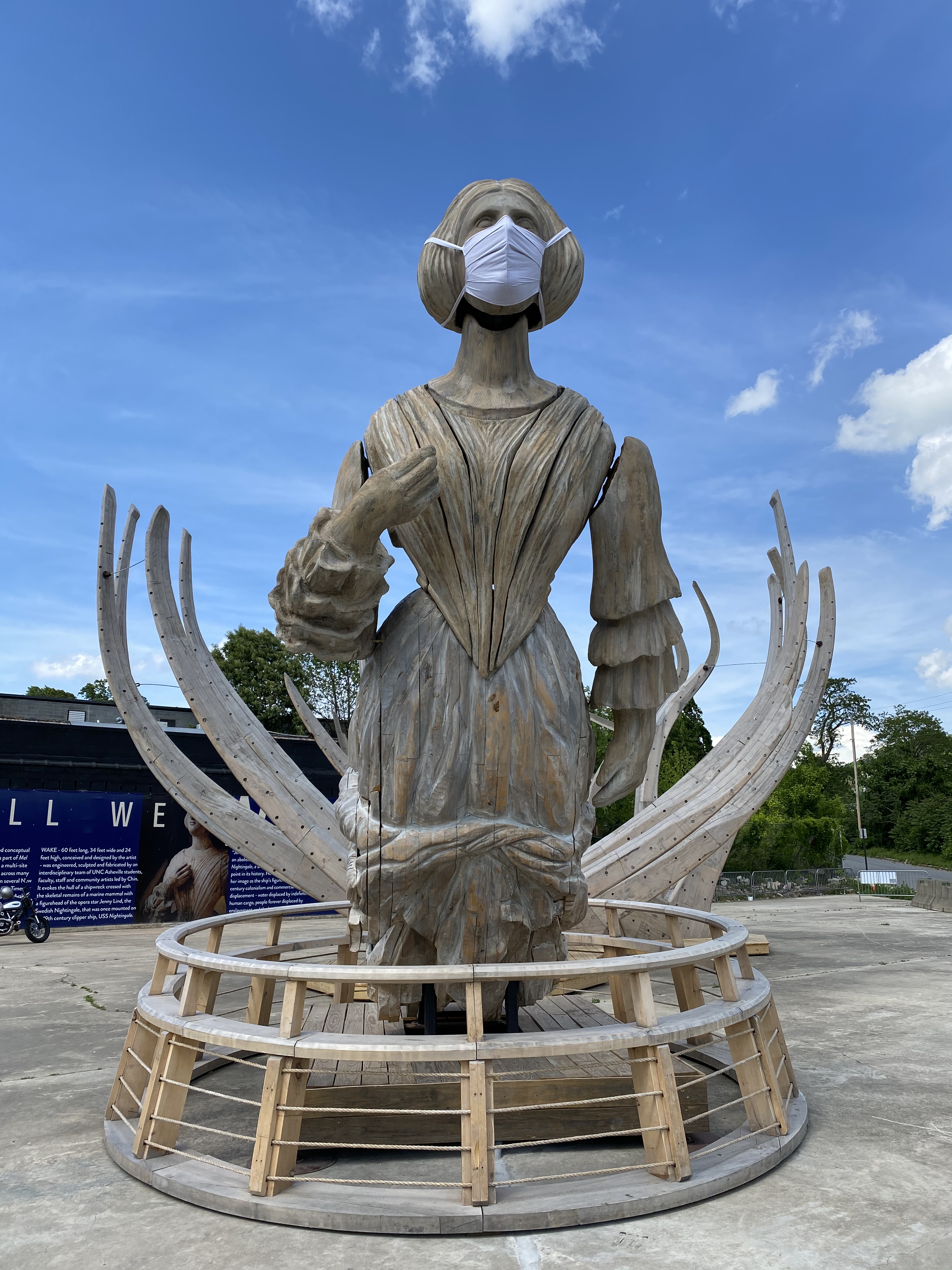Community members in Asheville mobilized to have a local showing and it was installed march 15 2020, just as the pandemic began to change our lives. It has been on display since with extended exhibition dates and a masked figurehead.